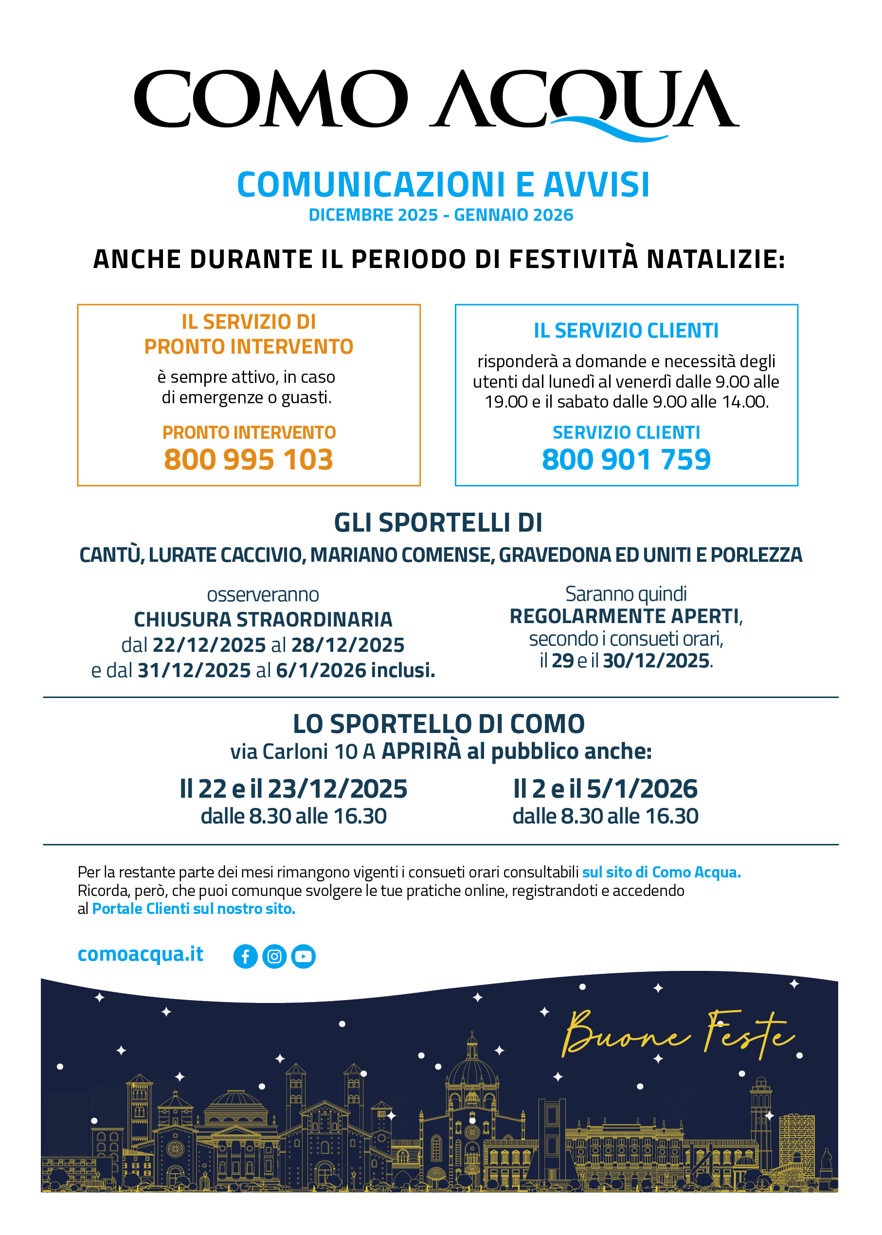 Gli SPORTELLI di Cantù, Lurate Caccivio, Mariano Comense, Gravedona ed Uniti e Porlezza osserveranno CHIUSURA STRAORDINARIA dal 22 dicembre 2025 al 28 dicembre 2025 e dal 31 dicembre 2025 al 6 gennaio 2026 inclusi. Saranno quindi regolarmente aperti, secondo i consueti orari, il 29 e il 30 dicembre 2025.